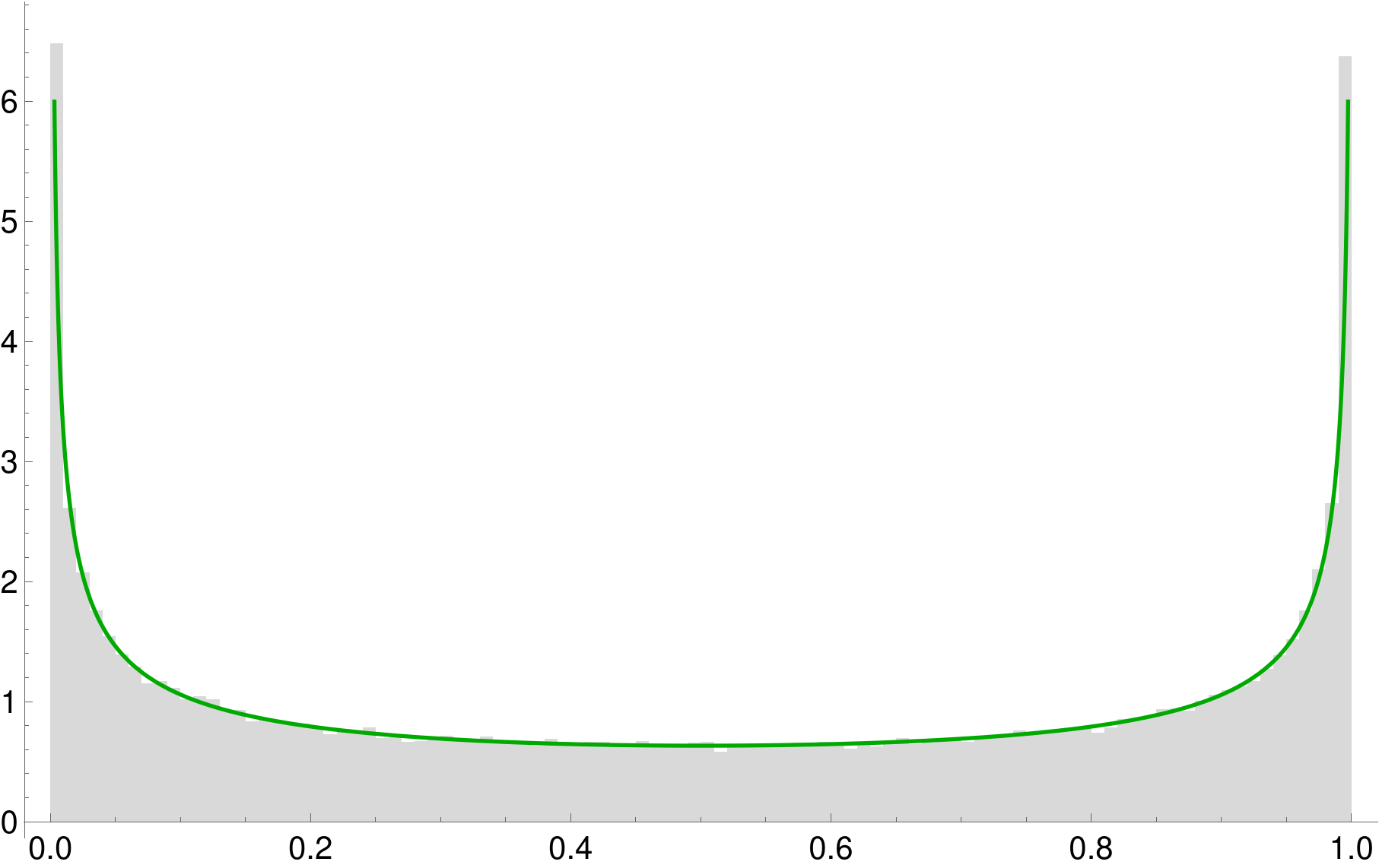One more thing that will reappear in the 2-dimensional case is the question of the asymptotic distribution of points. I.e., as the spider keeps spinning its web, there apear darker and lighter areas. Perhaps in its chaotic journey the point stays at some locations more often than at others? In other words, is there some probability distribution associated with the map? Let's perform a numerical experiment: divide the interval \([0,1]\) into 100 bins nd count how many times the point visits each bin. After a 100 thousand iterations we get this distribution: