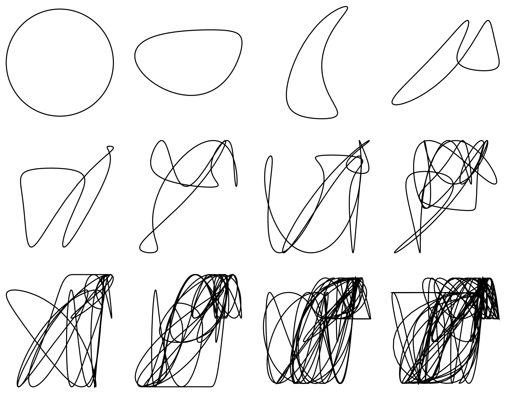 One could ask not just about points, but complete curves being transformed. In particular, what happens to a circle upon subsequent transformation. Why a circle? Because it is the simplest curve that could give a sense of direction of travel, a sort of flow on the attractor.