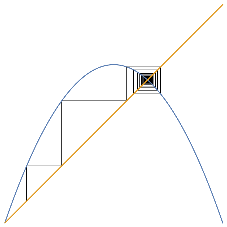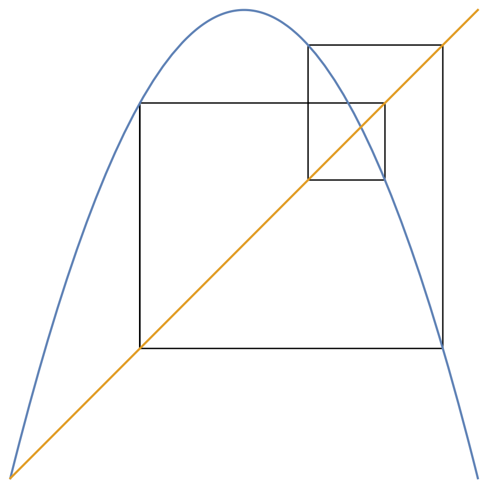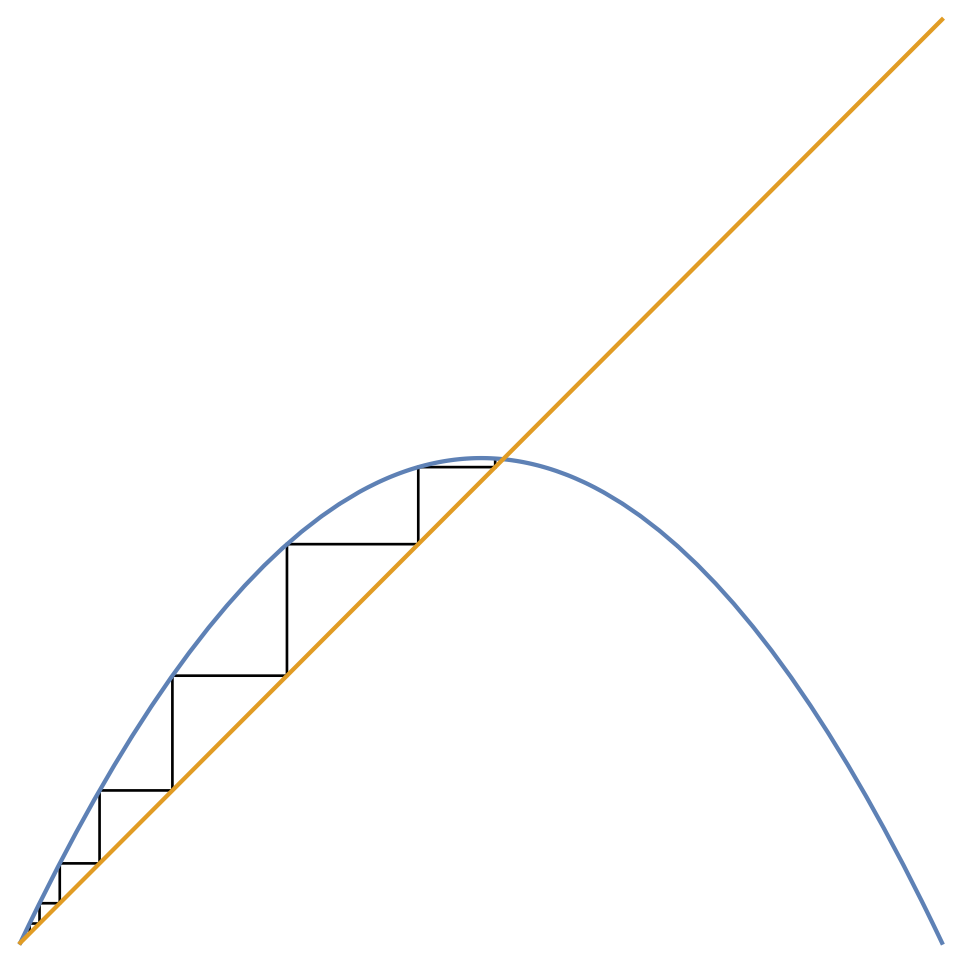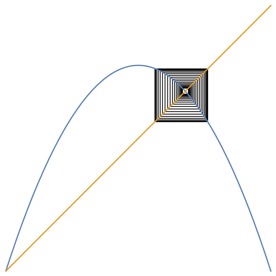 - The function \(f\) does not need to be a smooth parabola. It can be just two straight lines shaped like \(\land\), i.e. the tent map, for which the cobweb is as intricate (warning: page in Japanese).