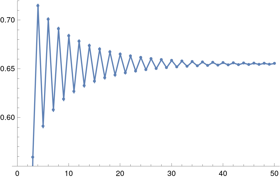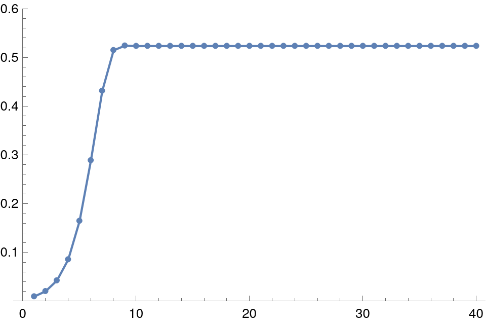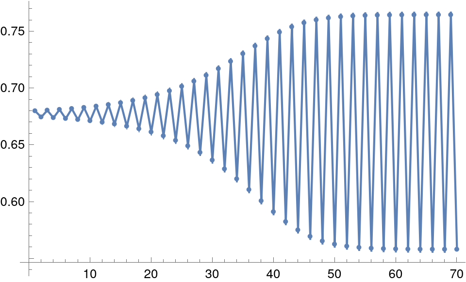 The first two show an inevitable evolution towards a stable point, where the population never changes. This point is given by the equation \(x = kx(1-x)\), whose one obvious solution is \(x=0\) (a rather sad, empty pond), and the other, more interesting solution is \(x_c=1-1/k\). The above scenarios in that the first has a monotonic increase, which strictlty speaking never reaches \(x_c\), except as a limit for \(t\rightarrow\infty\). The second, on the other hand, oscillates around \(x_c\), getting ever closer. The values of \(k\) are 2.1 and 2.9 respectively, and that's why the limits are different in the graphs.