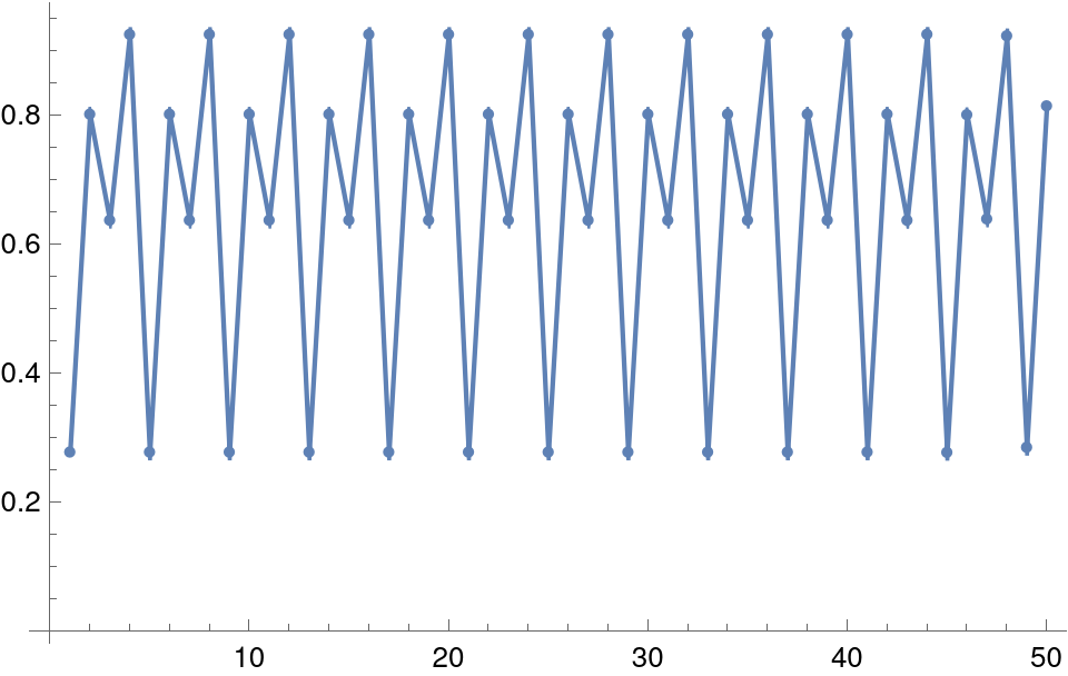 But these are just images, obtained with floating point calculation to make things worse, so can we be sure that this is not some kind of artifact? It is quite easy to find the exact periodic orbits in fact. Recall that the fixed point \(x_c\) is a solution of \(x=f(x)\), which is a quadratic equation. We can likewise ask for a solution of \(x = f(f(x))\), i.e. a point that returns to its origin, after two transformations. And yes, \(x_c\) trivially satisfies the second equation too, so we have to look among all solutions. Fortunately \(f(f(x))\) is a quartic polynomial so we can hope for as many as 4 solutions between 0 and 1 (depending on the value of \(k\)). For the right image, a solution of \(x=f(f(f(f(x))))\) had to be found numerically 1.1.