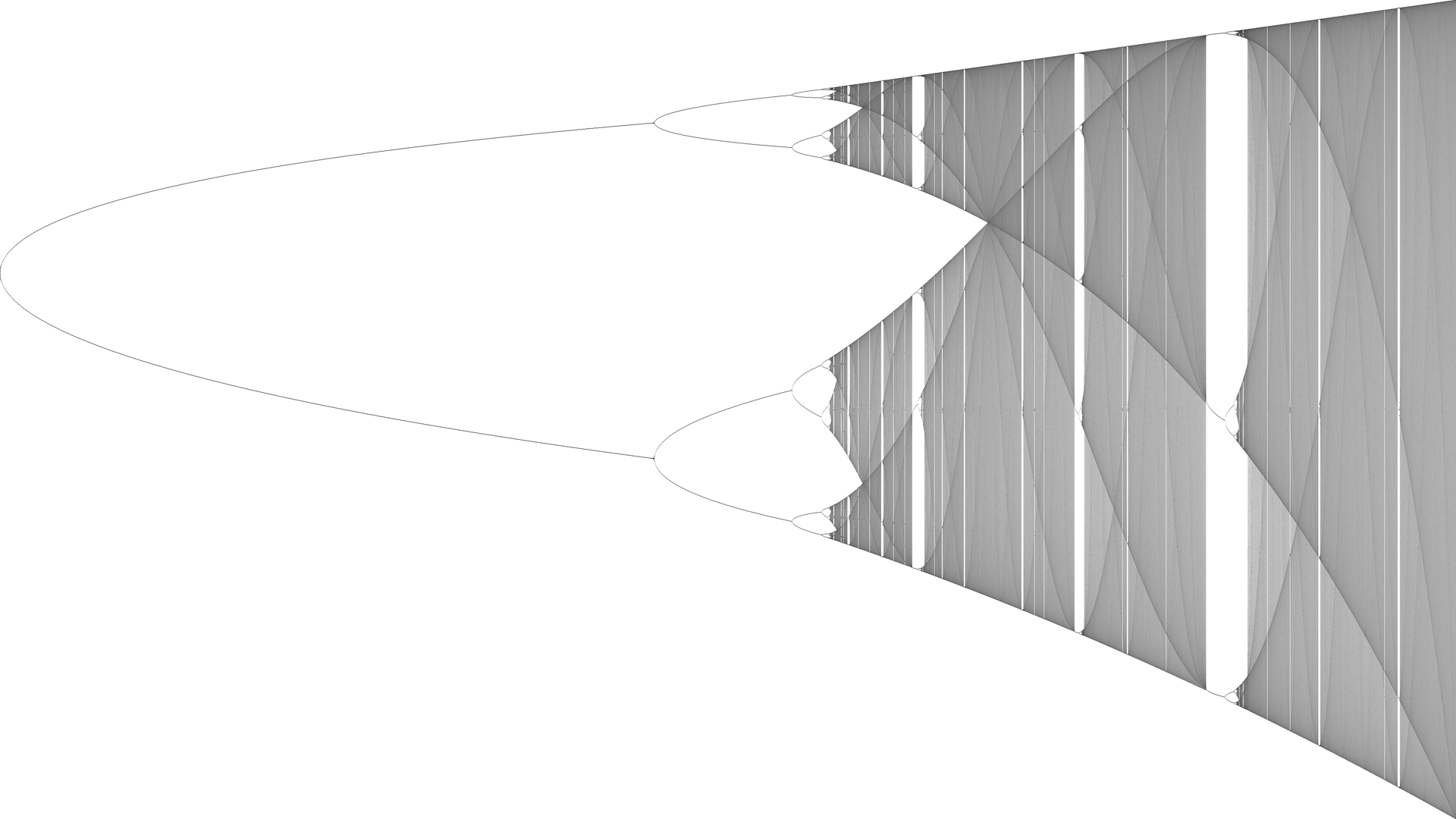 Let's plot them all at once! Because we need one graph dimension to run over the values of \(k\), and another to denote the bins of \(x\), the actual height of the bins will be marked with color (if we want a 2D drawing) — like a topographic map. Thus, the above graph would just be a very thin strip at \(k=4\), black at its edges where the bins are high, and almost white in the middle, where they are low. Taking about 2000 bins for \(x\), and 40000 values of \(k\) between 3 and 4, the “map” looks like this (\(k\) is the abscissa):