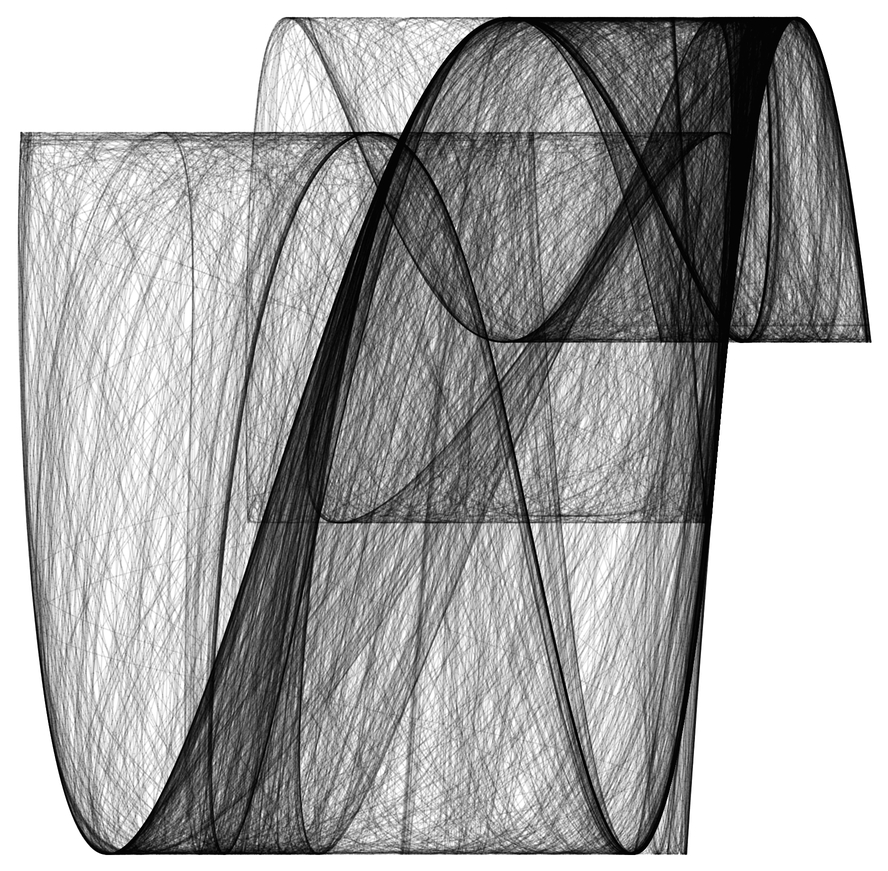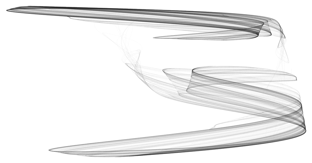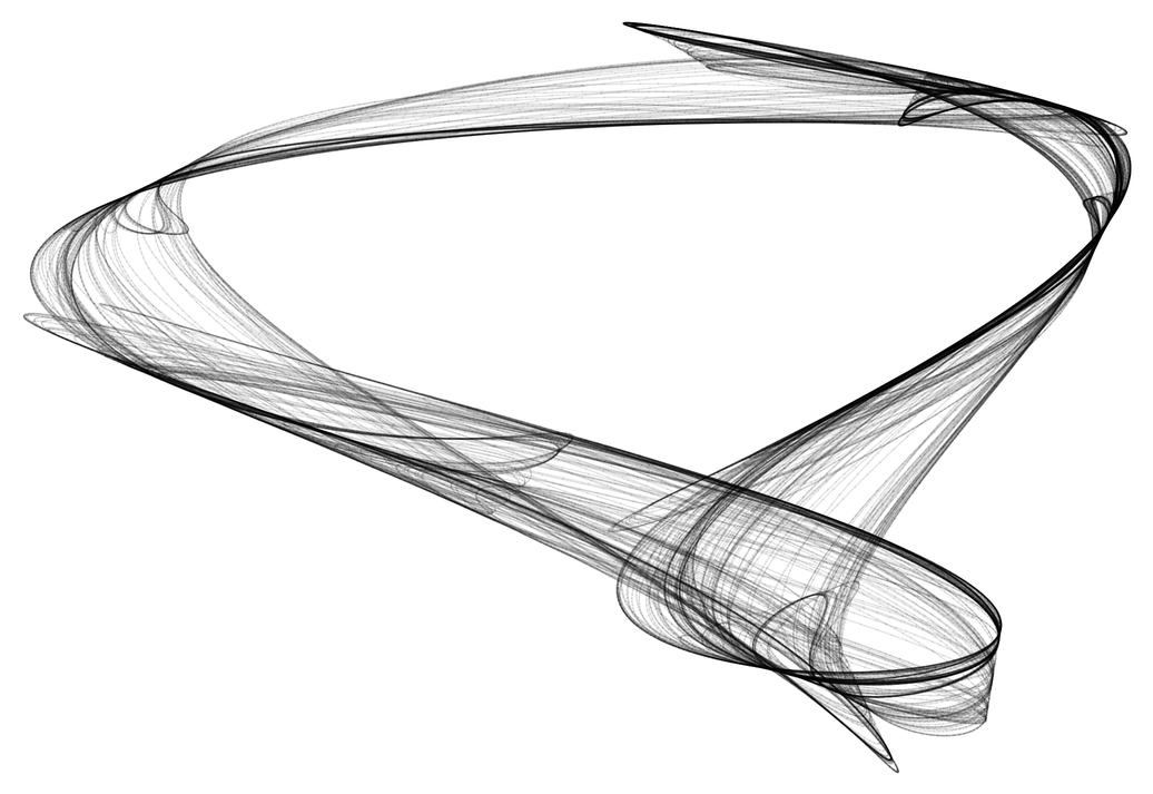 For example, take the following circle in the \((\alpha, \gamma)\) plane $$ \alpha(s) = \alpha_0 + r\cos(s), \quad \gamma(s) = \gamma_0 + r\sin(s),\\$$ and similarly for \((\beta,\delta)\). Some trial and errors is needed to find “nice” values for \(\alpha_0\), \(\gamma_0\) and \(r\) — sometimes the attractor breaks along the way, or degenerates into single points. But the effort pays off; here are two results (best view it full-screen):