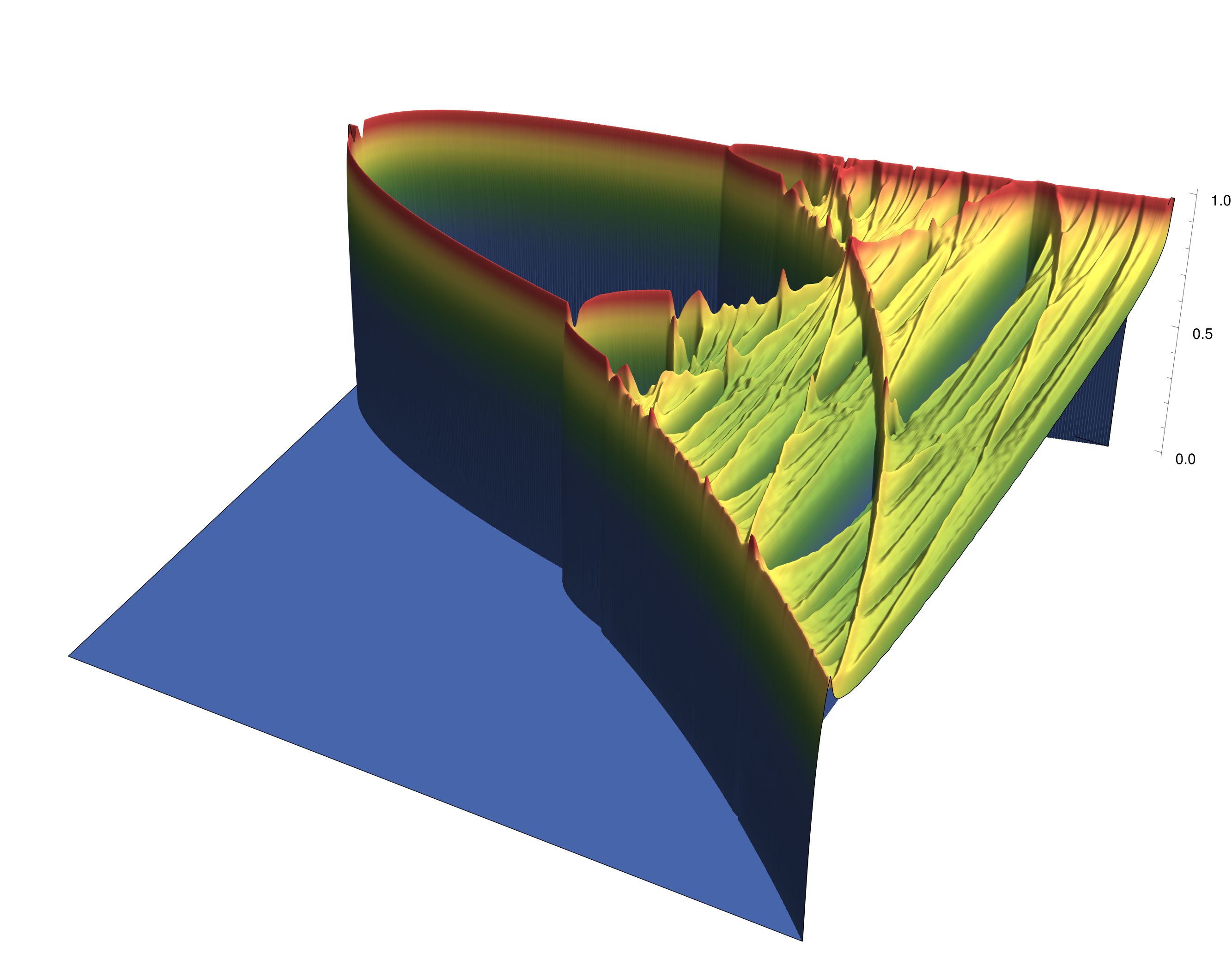 I can now divulge the secret formula behind the flying carpet itself: $$\begin{aligned} x_{t+1} &= 3.737x_t(1 - 1.17 x_t - 0.15 y_t),\\ y_{t+1} &= 3.737y_t(1 - 1.09 y_t), \end{aligned}$$ not that it's enough to get the above images by itself, so let's try to replicate some of the steps taken when studying the logistic map. The first obvious question is, how to even visualize the transformation \((x,y)\mapsto (f(x,y),g(x,y))\). Each of the functions alone can be shown in a “3D” plot, but a true graph would have to be 4-dimensional: transforming a (2D) plane into a (2D) plane. We can't fit that on a screen, and no simple analogon of the blue parabola of the previous sections exists.